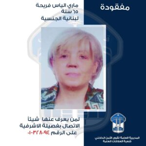 – ماري الياس فريحة (مواليد عام 1957، لبنانية) التي غادرت بتاريخ 22-7-2022، منزلها الكائن في محلّة الأشرفيّة، الى جهة مجهولة، ولم تَعُد لغاية تاريخه. لذلك، يرجى من الذين شاهدوها أو لديهم أي معلومة عنها أو عن مكان وجودها، الاتصال بفصيلة الأشرفيّة في وحدة شرطة بيروت على الرقم: 328094-01، للإدلاء بما لديهم من معلومات.