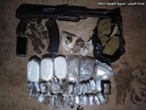 بتاريخ 10 / 8 / 2022 دهمت قوة من الجيش منزل المواطن (ع.ق.) في منطقة باب الرمل – طرابلس وأوقفته وضبطت سلاحاً حربياً نوع كلاشينكوف وممشطاً وكمية من الذخائر والمخدرات. سلمت المضبوطات وبوشر التحقيق مع الموقوف بإشراف القضاء المختص.