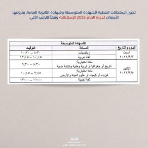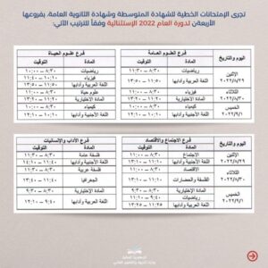 أخبار لبنانية “التربية” تُعلن مواعيد الإمتحانات الرسمية للدورة الثانية 2022-08-17 0 أعلنت وزارة التربية مواعيد إجراء الإمتحانات الرسمية للشهادة المتوسطة وشهادة الثانوية العامة بفروعها الأربعة للدورة الثانية لعام 2022. ??خدمة الخبر العاجل??