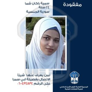 – سمية راكان شما (مواليد عام 1998، سورية) التي غادرت بتاريخ 15-8-2022، منزلها الكائن في محلة أبي سمراء إلى جهة مجهولة، ولم تَعُد لغاية تاريخه. لذلك، يرجى من الذين شاهدوها أو لديهم أي معلومة عنها أو عن مكان وجودها، الاتصال بفصيلة أبي سمراء في وحدة الدرك الإقليمي على الرقم: 434834-06، للإدلاء بما لديهم من معلومات.