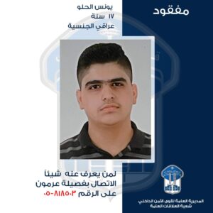عمّمت المديرية العامة لقوى الأمن الداخلي، بناءً على إشارة القضاء المختص، صورة القاصر المفقود: يونس أحمد يحي الحلو (مواليد عام 2005، عراقي الجنسية) الذي غادر مساء تاريخ 2-9-2022، منزل ذويه الكائن في محلّة تلال خلدة، ولم يعد حتى تاريخه. لذلك، طلبت هذه المديرية من المواطنين الكرام الذين شاهدوه أو لديهم أي معلومة عنه أو عن مكان وجوده، الاتصال بفصيلة عرمون في وحدة الدّرك الإقليمي على رقم: 818503/05، للإدلاء بما لديهم من معلومات.