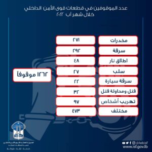 نتيجة الإستقصاءات والتحريّات المكثّفة، تمكّنت قطعات قوى الأمن الدّاخلي في خلال شهر آب المنصرم من إلقاء القبض على /1262/ شخصًا بجرائم مختلفة منها: قتل ومحاولة قتل، وسرقة، وسلب، ومخدّرات، وتهريب أشخاص، وإطلاق نار، وعنف أُسري، وغيرها. أودع الموقوفون المرجع القضائي المختصّ بناء على إشارته.