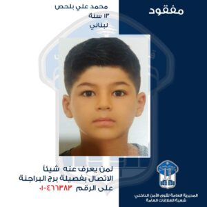 تُعمِّم المديريّة العامّة لقوى الأمن الدّاخلي بناءً على إشارة القضاء المختص، صورة القاصر المفقود: