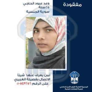 – وعد عبّود الحاجي (من مواليد عام 1997، سوريّة الجنسيّة) التي غادرت بتاريخ 12-9-٢٠٢٢، منزل زوجها، الكائن في محلّة الشّيّاح، ولم تَعُد لغاية تاريخه. لذلك، يرجى من الذين شاهدوها أو لديهم أي معلومة عنها أو عن مكان وجودها، الاتّصال بفصيلة الغبيري في وحدة الدّرك الإقليمي، على الرقم: 543256- 01، للإدلاء بما لديهم من معلومات.