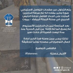 أخبار لبنانية خبر كاذب 2022-09-22 0 الدرابزين المثبّت على الجدار الفاصل لجادة الرئيس الحريري في محلة الرملة البيضاء – بيروت لم يُسرق إنما أزيل إثر حادث سير. ??خدمة الخبر العاجل??