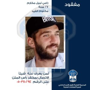 – رامي نبيل مكارم (مواليد عام 1995، مكتوم القيد) الذّي غادر بتاريخ 26-09-2022 منزله الكائن في محلة رأس المتن إلى جهة مجهولة، ولم يَعُد لغاية تاريخه. علمًا أنه يعاني من إنفصام في الشخصية. لذلك، يرجى من الذين شاهدوه أو لديهم أي معلومة عنه أو عن مكان وجوده، الاتصال بمخفر رأس المتن في وحدة الدرك الإقليمي، على الرقم: 380294-05، للإدلاء بما لديهم من معلومات.