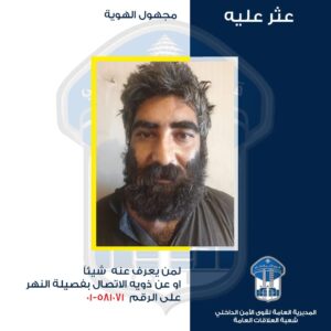 تعمّم المديريّة العامّة لقوى الأمن الدّاخلي، بناءً على إشارة القضاء المختص، صورة شخص مجهول الهويّة عُثر عليه بتاريخ 27-09-2022 في محلّة الجعيتاوي- الأشرفية، وليس بحوزته أي مستند يعرّف عنه ولا يمكن التّواصل معه، ولا يمكنه تحديد مكان إقامته، ويعاني من أمراض عقليّة. لذلك، يرجى من ذويه أو ممن يعرف عنه شيئاً، الاتصال بفصيلة النهر في وحدة شرطة بيروت على الرقم 581071-01، تمهيداً لاتخاذ الإجراءات القانونية اللازمة.