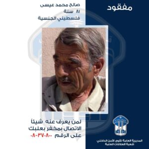 صالح محمد عيسى (مواليد عام 1941، فلسطيني الجنسيّة) الذّي غادر مكان إقامته في بعلبك- مخيّم الجليل بتاريخ 19/09/2022، ولم يعُد لغاية تاريخه، علمًا أنّه يُعاني من مرض الـ “الزهايمر”. لذلك، يُرجى من الذين شاهدوه أو لديهم أي معلومة عنه أو عن مكان وجوده، الاتصال بمخفر بعلبك في وحدة الدّرك الإقليمي على الرقم: 370800-08، للإدلاء بما لديهم من معلومات.